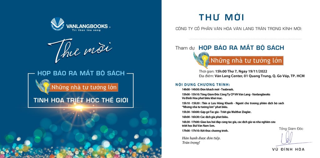 DĐKP giới thiệu: Hôm 19.11.2022, Văn Lang Books đã tổ chức rất thành công buổi họp báo ra mắt bộ sách triết học „Những nhà tư tưởng lớn“ bao gồm 19 tác phẩm. Hiếm khi ở Việt Nam có một kiểu họp báo tương tự: vừa trực diện tại hội trường vừa trực tuyến chạy song song, lại là buổi họp báo song ngữ có người dịch tại chỗ, tạo nên một buổi giao lưu văn hóa quốc tế đầy ý nghĩa, một cơ hội trao đổi trực tiếp giữa tác giả, dịch giả và độc giả. Tổ chức họp báo theo dạng đó không dễ dàng, nhưng Văn Lang Books đã tổ chức thành công rực rỡ, mang lại một „hào khí triết học“ và nguồn cảm hứng cho mọi thành viên tham dự, từ cử tọa đến các dịch giả và tác giả Dr. Ziegler. DĐKP hân hạnh giới thiệu hai bài phát biểu, một của người chủ trương dự án dịch thuật, TS triết học Lưu Hồng Khanh, và một của chính tác giả bộ sách, TS triết học Walther Ziegler. Dù chỉ là hai bài chào mừng, nhưng cũng là hai tiểu luận hàm chứa những ưu tư triết học cho hiện tại và tương lai.
