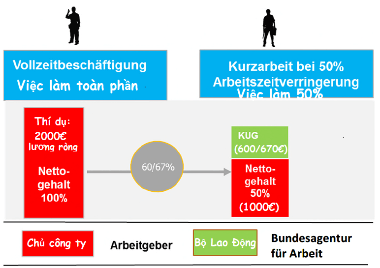 Sau khi kích hoạt cơ chế làm ít thời gian, lương ròng mà doanh nghiệp trả cho lao động chỉ còn một nửa, tức 1000€ (thực ra có khác chút đỉnh, nhưng để dễ cắt nghĩa, xem là gần như thế!), số chênh lệch 1000€ thì bộ lao động đền bù 600€ hoặc 670€ tùy trường hợp. Như vậy, người lao động chỉ làm việc nửa ngày (50%) và mất đi khoảng 20% lương ròng so với trước. Trong mùa Covid, tiền đền bù từ bộ lao động nhiều hơn, 700€ hoặc 770€, cho nên thu nhập ròng hàng tháng thực tế chỉ giảm chừng 15%, sau sáu tháng chỉ còn giảm 10%.