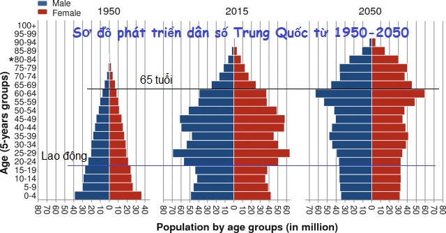 Năm 1950, cấu trúc nhân học của Trung Quốc còn mang dạng hình tháp, vốn là điều kiện lý tưởng để phát triển quốc gia và xây dựng hệ thống an toàn xã hội. Trong thời gian đó, tỉ lệ người già so với lực lượng lao động khoảng chừng 5-8%. Đến năm 2015, tỉ lệ đó đã tăng lên 13-15%. Điều này có nghĩa là tỉ lệ của lực lượng lao động giảm xuống so với tổng dân số ngày càng đông và già, lợi tức mỗi đầu người vì thế không những không tăng mà có nguy cơ giảm xuống, mặc dù GDP có thể vẫn còn tăng. Ngoài ra, hệ thống xã hội để phục vụ nhu cầu của người già khó lòng thực hiện tốt. Sang đến 2050, tỉ lệ người già trên lực lượng lao động sẽ là 30-40%. Tức là cứ 1,5 đến 2 lao động phải trang trải gánh nặng xã hội cho một người già. Trong một quốc gia chưa giàu như Trung Quốc, điều đó có ý nghĩa như một quả bom nổ chậm có thể làm nổ tung sự an toàn xã hội, có thể dẫn đến rối loạn xã hội và khủng hoảng chính trị. Việt Nam cũng sẽ có sự phát triển tương tự.