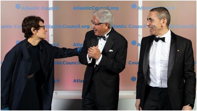 Özlem Türeci, Victor Dzau và Ugur Sahin tại Giải thưởng Lãnh đạo Xuất sắc của Hội đồng Đại Tây Dương vào ngày 10 tháng 11 năm 2021. Ảnh qua Elman Studio / cho Hội đồng Đại Tây Dương.