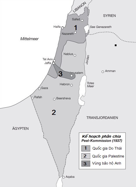 Tuy nhiên kể từ thập niên 1930, sự gia tăng đáng kể lượng người Do Thái trốn chạy Đức Quốc xã đến Palestine đã dẫn đến tình trạng bất ổn mới. Sau khi bắt đầu cuộc tẩy chay của người Ả Rập vào năm 1936, Anh thành lập “Ủy ban Peel” và sau đó công bố báo cáo của mình vào tháng 7 năm 1937. Báo cáo này lần đầu tiên nói về sự phân chia vùng Palestine thành hai quốc gia, Do Thái và Ả Rập. Đối với những người theo chủ nghĩa phục quốc Do Thái, sau những cuộc thảo luận sôi nổi, Đại hội Thế giới của họ đã chấp nhận đề xuất thành lập hai quốc gia, nhưng người Ả Rập ở Palestine thì bác bỏ nó ngay lập tức, vì như thế họ phải chia đất và chủ quyền cho một bộ phận thiểu số mới nhập cư sau này. Điều này dẫn đến bạo lực gia tăng, nhiều nhà lãnh đạo Palestine bị bắt giữ và người lãnh đạo tối cao của Palestine Mohammed Amin al-Husaini phải bỏ trốn ra nước ngoài [xem Philipp]. Tuy kế hoạch chia đất của Ủy ban Peel không được thực hiện, nhưng ý tưởng này vô tình là cơ sở cho một giải pháp 10 năm sau dưới ảnh hưởng thao túng của một đại cường khác.