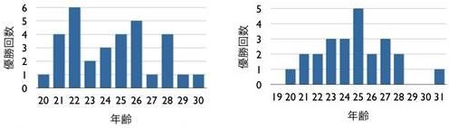 Quan hệ giữa số lần vô địch (trục tung) và số tuổi (trục hoành) của Hakuhô (Hình bên trái)và Kitanoumi (Hình bên phải) như dưới đây.
