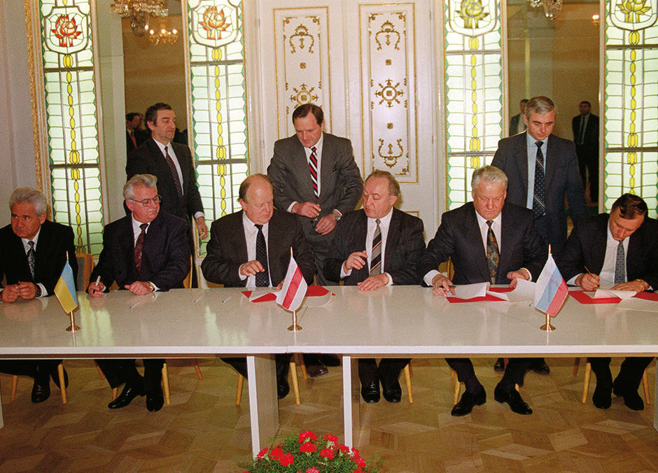 Ngày 8/12/1991, các nguyên thủ quốc gia L. Kravtschuk (Ukraine, thứ 2 từ trái sang), S. Schushkevich (Belarus, thứ 3 từ trái sang) và B. Yeltsin (Nga, thứ 2 từ phải sang) quyết định giải thể Liên Xô. (© Ria Nowosti / Getty Images)