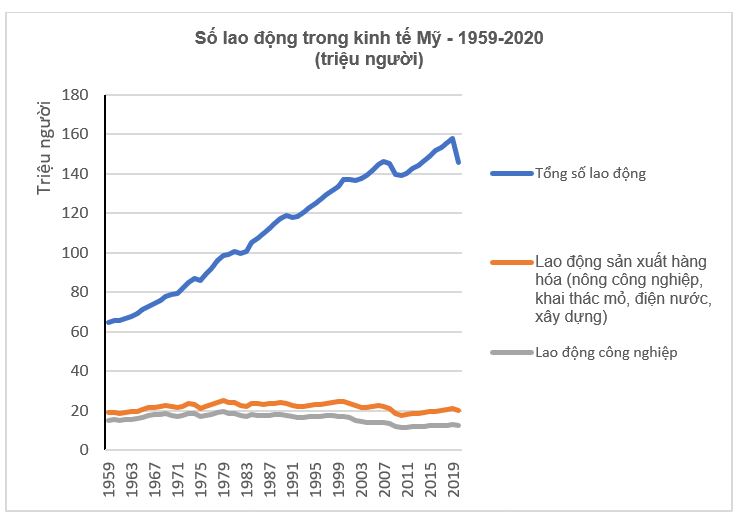 Bài viết của tác giả trên Thời đại mới (2020) đã phân tích về sự chuyển biến của kinh tế Mỹ. Công nghiệp trong nền kinh tế Mỹ đã từng tạo ra việc làm cho 30% lao động trong toàn xã hội những năm 1930, nhưng hiện nay chỉ còn 9%. Tệ hơn thế, tính theo số tuyệt đối, số người có việc làm trong công nghiệp cũng đã giảm từ đỉnh cao gần 19 triệu năm 1980 xuống còn khoảng 12 triệu năm 2020, và sẽ tiếp tục giảm, trong khi tổng lao động ở Mỹ tăng hơn gấp đôi, từ 65 triệu lên 145 triệu.