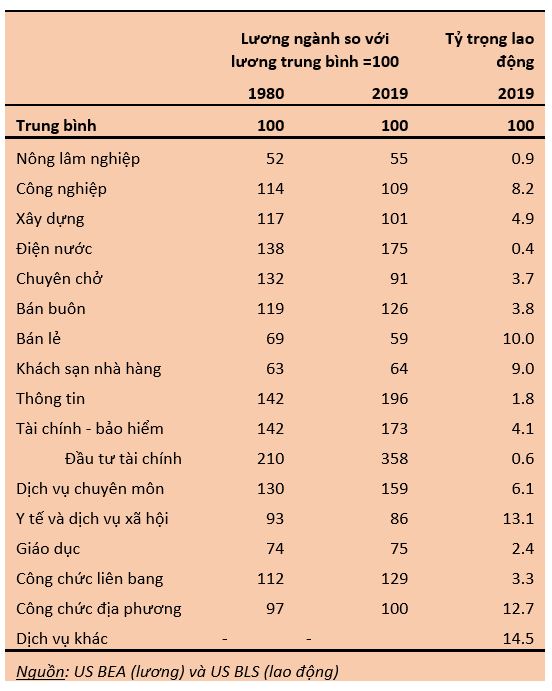84% lao động hiện nay là làm dịch vụ, mà dịch vụ tăng trưởng lớn nhất là, y tế và coi sóc người già với lương thấp (trừ bác sĩ) và công chức và dịch vụ bán lẻ. Năm 2019, lương cao hơn mức trung bình 100% – gấp 2-5 lần – chỉ còn nằm trong vài ngành dịch vụ như dịch vụ thông tin (196%), đầu tư tài chính (358% ) và dịch vụ chuyên môn (158%), và công chức liên bang (129%), và số này chiếm khoảng 12% tổng số lao động ở Mỹ.