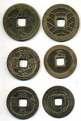 Hình: Hàng đầu là đồng tiền 4 văn, hàng giữa và cuối là 1 văn (tiếng Nhật đọc là mon), phát hành năm 1636 cho đến 1868.