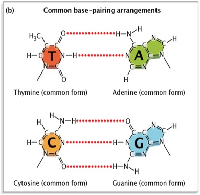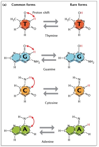Các gốc purine và pyrimidine trong DNA tồn tại ở hai dạng biến đổi hoặc dạng hóa học khác nhau. (Bảng a): Các bazơ nucleotide chuyển từ dạng “xeto” phổ biến sang dạng “enol” hiếm hơn, đồng phân của chúng. (Bảng b): Trong cách sắp xếp cặp bazơ chung, dạng chung của thymine (T) liên kết với dạng chung của adenine (A), và dạng chung của cytosine (C) liên kết với dạng chung của guanine (G). (Bảng c): Sự sắp xếp cặp bazơ hiếm xảy ra khi một nucleotide trong cặp bazơ là dạng hiếm thay vì dạng phổ biến. Ở đây, dạng cytosine hiếm liên kết với dạng phổ biến của adenine thay vì guanine.Dạng hiếm của guanine liên kết với dạng phổ biến của thymine thay vì cytosine.