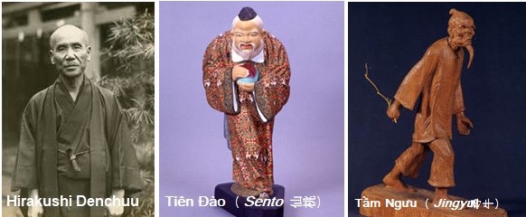 (3) Hirakushi Denchuu 平櫛田中(1872~1979):Tên thật là Takutarô. Cho đến trên 50 tuổi vẫn còn phải khổ cực trong cảnh ngộ nghèo khó. Ông có 3 người con nhưng 2 người qua đời vì bệnh lao. Ông để lại những lời sau: “Con người có thể chịu đựng với nghèo khó nhưng không có gì đau khổ bằng việc mất con”, “tôi phải mất 3 năm mới hết đổ lệ”. Tác phẩm “Ấu Nhi Cẩu Trương Tử” ông đã lấy hình ảnh con trai trưởng ném đồ chơi cho con chó tên Trương Tử làm mẫu. Tác phẩm “Tầm Ngưu” là tác phẩm trước khi ông qua đời. Tầm Ngưu là giai đoạn đầu tiên của tác phẩm thi họa “Thập Ngưu Đồ”, tác giả là thiền tăng Khuếch Am廓庵 để diễn tả 10 giai đoạn tiến tới ngộ của thiền đạo.