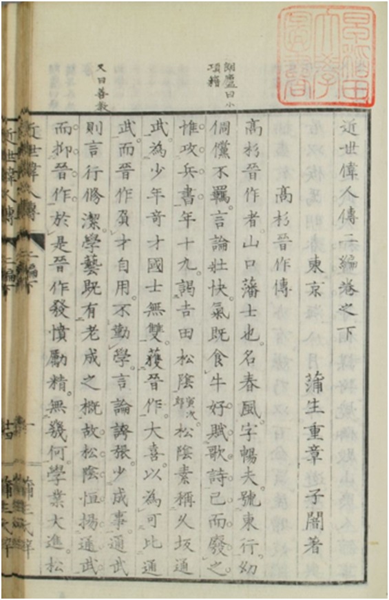 Gamo Shigeaki 蒲生重章 (1833~1901): Cận Thế Vĩ Nhân Truyện, xuất bản năm 1878.
