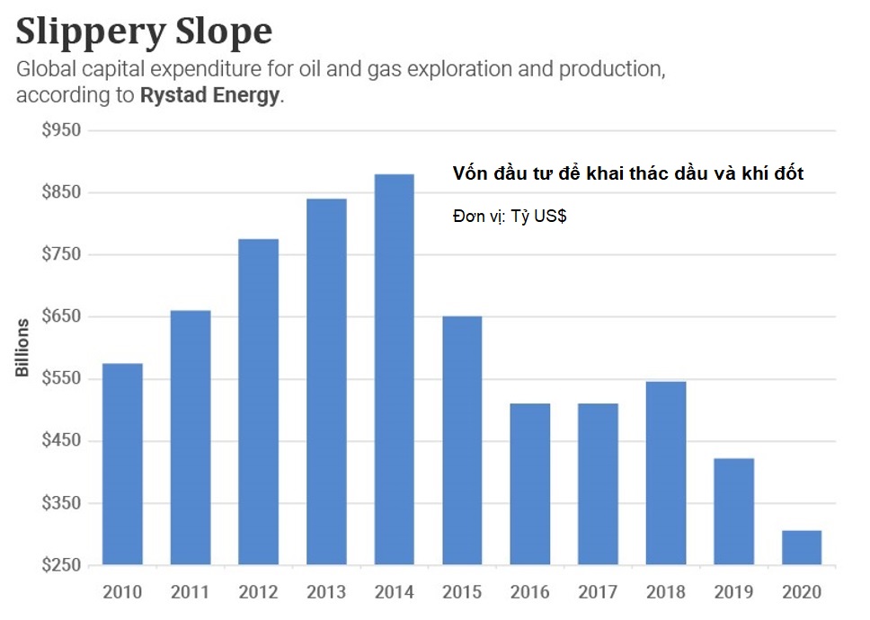 Biểu đồ cho thấy vốn đầu tư toàn cầu dành cho hoạt động thăm dò dầu khí giảm đáng kể, kể từ năm 2014.