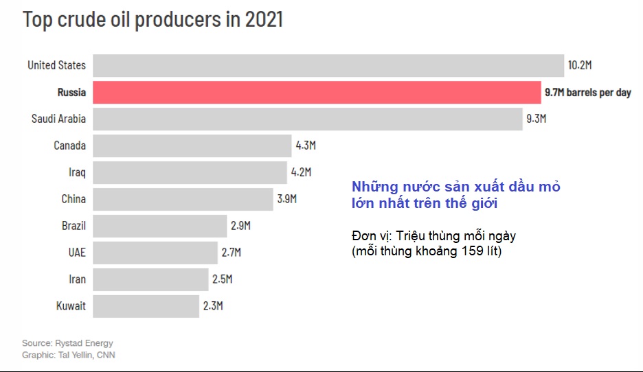 Biểu đồ cho thấy Nga là nhà sản xuất dầu lớn thứ 2 toàn cầu vào năm 2021