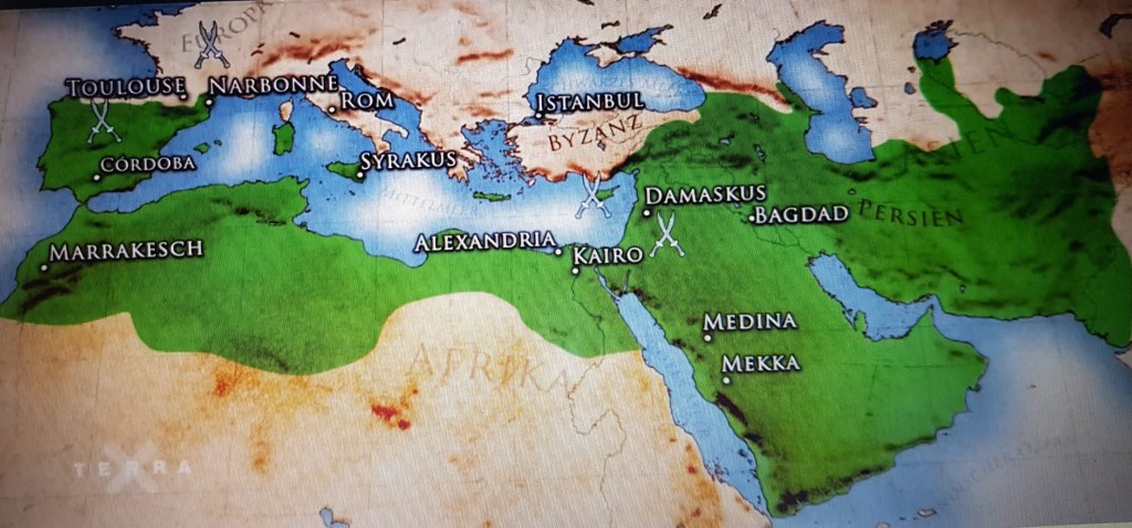 Sau khi Muhammad chết năm 632, các đội quân Hồi giáo tiến lên phía bắc thâu tóm Ba Tư, đánh chiếm Byzantine và mở rộng biên giới đến tận Azerbaijan. Về phía tây họ chiếm Bắc Phi, sau đó vượt eo biển Đại Tây Dương để chiếm bán đảo Iberia, tức Tây Ban Nha hiện nay. Chỉ sau một thế kỷ, họ đã xây dựng một đế chế rộng hơn cả đế chế La Mã thời cực thịnh.