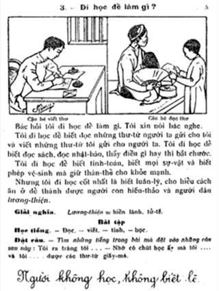 2) Bài 3 nói trên giới thiệu mục đích của đi học như sau: 1) Biết đọc (thư từ, và sách báo), và thấy điều hay thì bắt chước, 2) Biết viết (thư từ), 3) Biết tính toán, 4) Biết mọi sự (kiến thức tổng quát), 5) Biết phép vệ sinh giữ gìn thân thể khỏe mạnh, và quan trọng nhất là 6) Biết luân lý, cách ăn ở thành được người con hiếu thảo và người dân lương thiện.