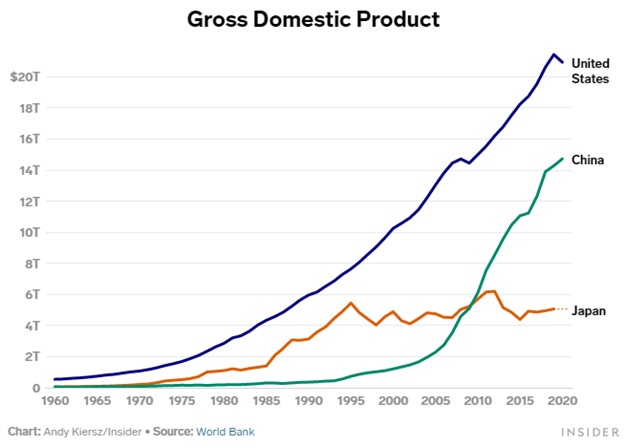 Đó có thể là Trung Quốc vào những năm 2020, nhưng đó cũng chính là Nhật Bản đã được trông thấy vào những năm 1980, khi đất nước này được ca ngợi như một phép màu kinh tế [1] và là mối đe dọa chính đối với vị thế đứng đầu của Mỹ. Tốc độ tăng trưởng trung bình 10% mỗi năm [2] của nó từ những năm 1960 trở đi đã giúp nó trở thành nền kinh tế lớn thứ hai thế giới vào những năm 1980, khi biểu tượng của các tập đoàn như Toyota và Sony đe dọa thay thế các đối tác Mỹ như Ford và General Electric.
