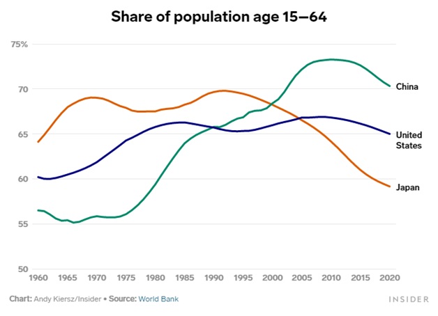 Một trong những vấn đề lớn mà nền kinh tế Nhật Bản gặp phải trong những năm 1990 là dân số già đi nhanh chóng. Đơn giản, dân số già đi có nghĩa là có ít lao động hơn, khiến tăng trưởng kinh tế khó khăn hơn. Chi phí lương hưu và chi tiêu phúc lợi tăng cao cũng gây áp lực lên chi tiêu công.