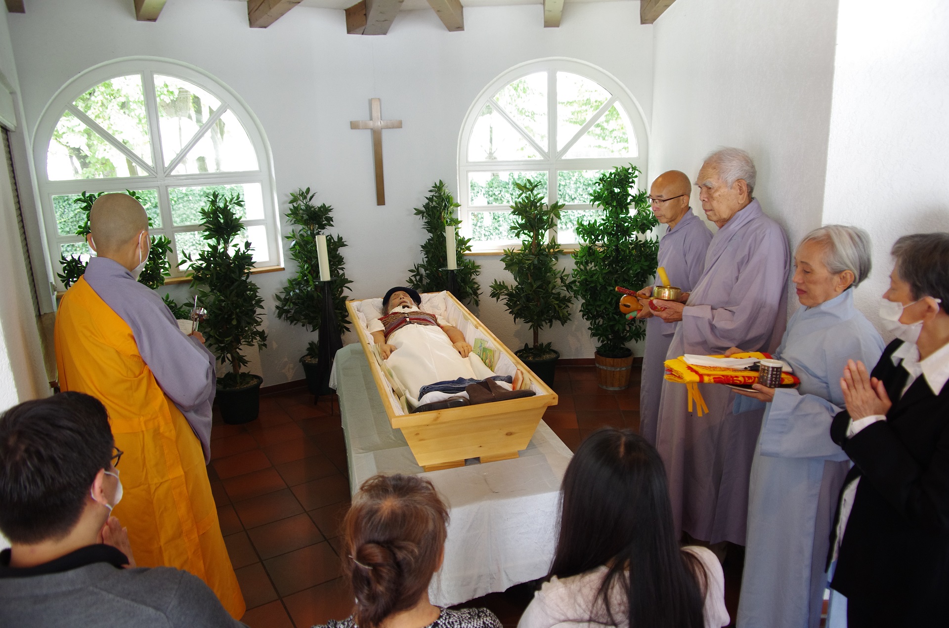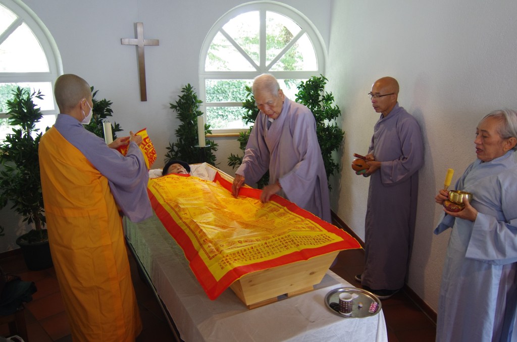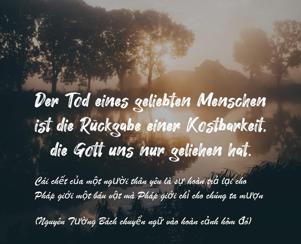 Tôi bỗng nhớ trên đường lái xe đến Kehl, radio có nói một câu mà sau đó tôi nói lại tiếng Việt với Ngân và Nhi: “Cái chết của một người thân yêu là sự hoàn trả lại cho Pháp giới một báu vật mà Pháp giới chỉ cho chúng ta mượn”. Ngân và Nhi cảm kích. Câu nguyên văn của radio là “Der Tod eines geliebten Menschen ist die Rückgabe einer Kostbarkeit, die Gott uns nur geliehen hat”. Tôi đã đổi từ “Gott” (Thượng đế) thành “Pháp giới” (Dharmadhatu) cho hợp với Vũ trụ quan (Kosmologie) Phật giáo của ngày hôm đó. (Và thực ra, nếu hiểu Gott là phi nhân trạng (unpersönlich) thì Gott chính là Pháp giới của Phật giáo).