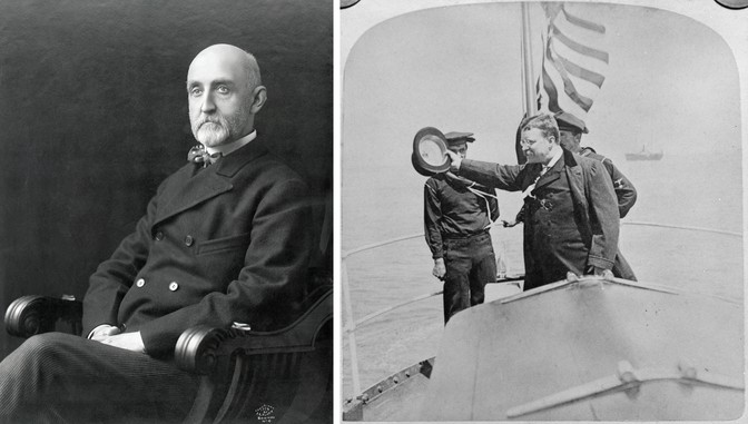 Đô đốc Alfred Thayer Mahan, trái, là người có ảnh hưởng lớn đối với Tổng thống Theodore Roosevelt, phải, trong ảnh ghi nhận màn chào của các tàu chiến từ boong tàu Algonquin ở Cảng Charleston, Nam Carolina, khoảng năm 1902. (Underwood & Underwood / Archive Photos / Getty)