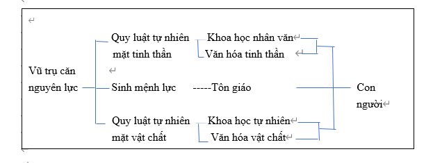 Hình trên chỉ các loại quan hệ giữa vũ trụ căn nguyên lực (6)và con người. Gồm có 3 loại quan hệ: đường (quan hệ với) sinh mệnh lực, đường (quan hệ với) quy luật tự nhiên mặt tinh thần, đường (quan hệ với) quy luật tự nhiên mặt vật chất. Như vậy, thái độ sống thuận theo trật tự của vũ trụ (5) gồm có 3 loại, và 3 loại lễ tương ứng như sau: